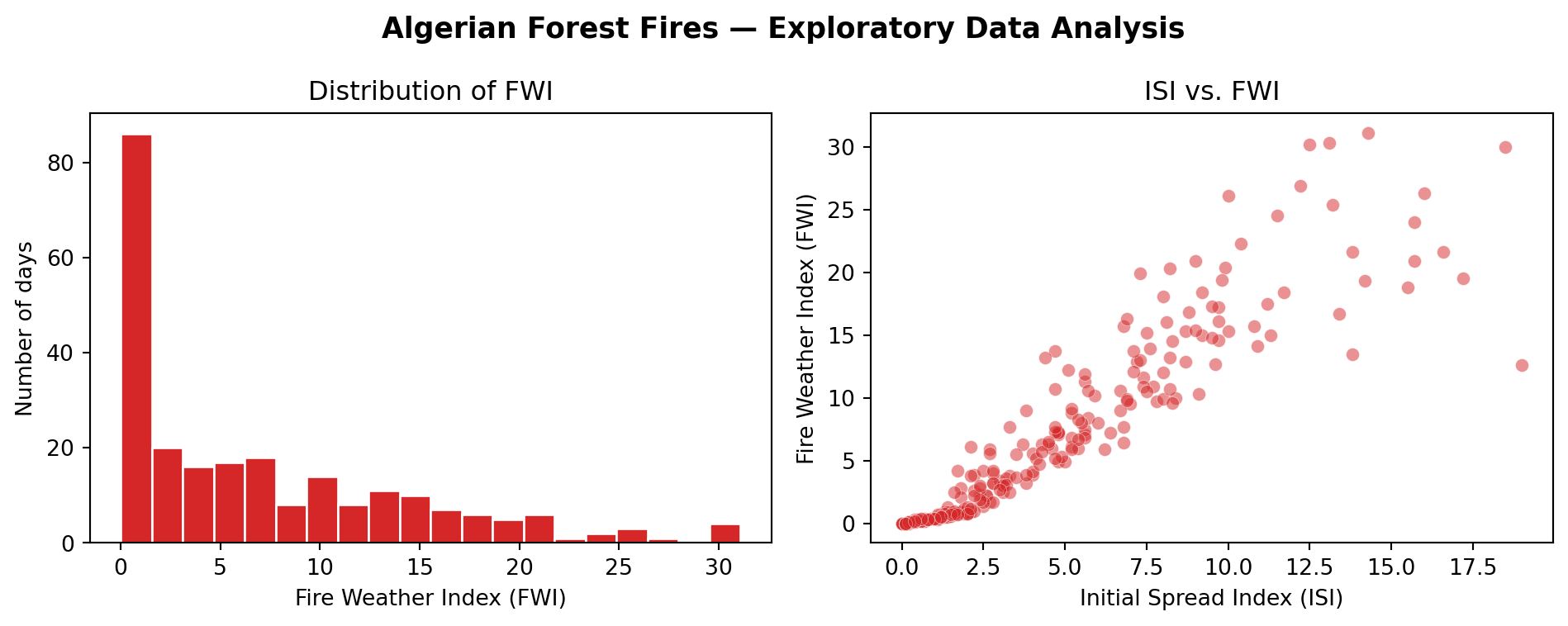 import matplotlib.pyplot as pltfig, axes = plt.subplots(1, 2, figsize=(10, 4))# --- Plot 1: FWI distribution ---axes[0].hist(df['FWI'], bins=20, color='#d62728', edgecolor='white')axes[0].set_xlabel('Fire Weather Index (FWI)')axes[0].set_ylabel('Number of days')axes[0].set_title('Distribution of FWI')# --- Plot 2: ISI vs FWI ---axes[1].scatter(df['ISI'], df['FWI'], alpha=0.5, color='#d62728', edgecolor='white', linewidths=0.3)axes[1].set_xlabel('Initial Spread Index (ISI)')axes[1].set_ylabel('Fire Weather Index (FWI)')axes[1].set_title('ISI vs. FWI')plt.suptitle('Algerian Forest Fires — Exploratory Data Analysis', fontsize=13, fontweight='bold')plt.tight_layout()plt.show()