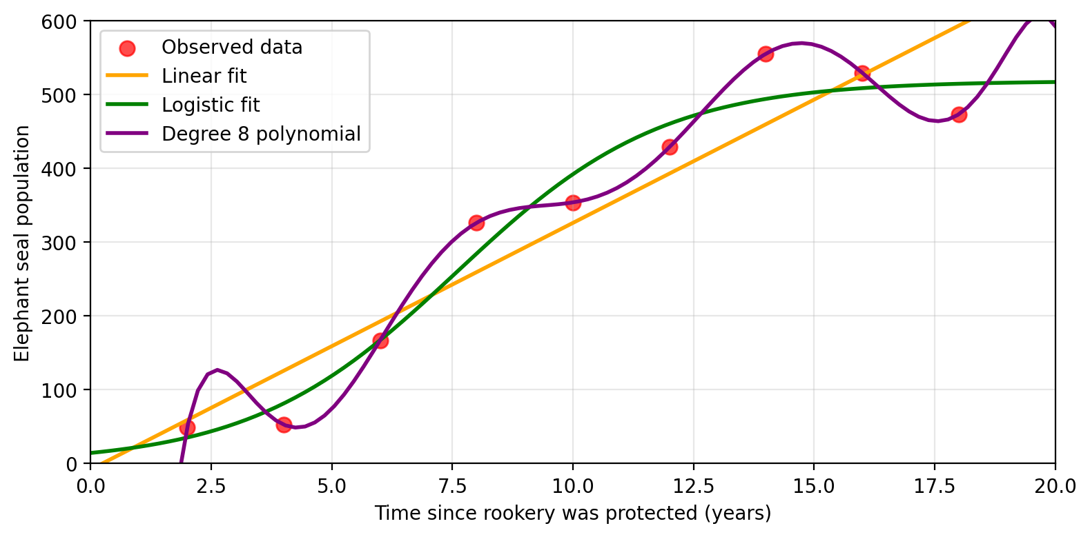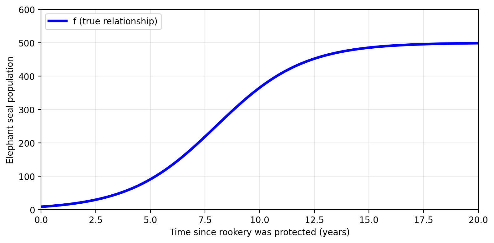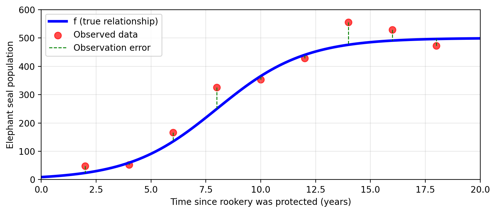 \[f(\text{time}) = \text{true population} = \text{observed population} + \epsilon\]