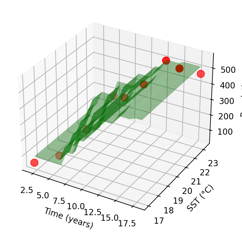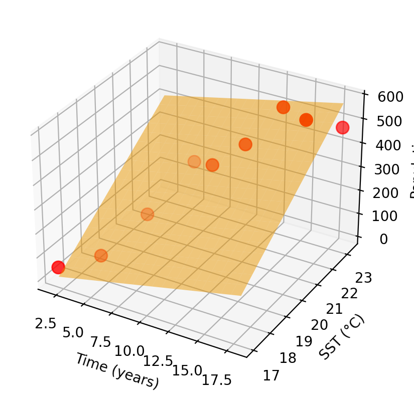 | Obs. | Time (Predictor 1) | SST (Predictor 2) | Population (Response) |
