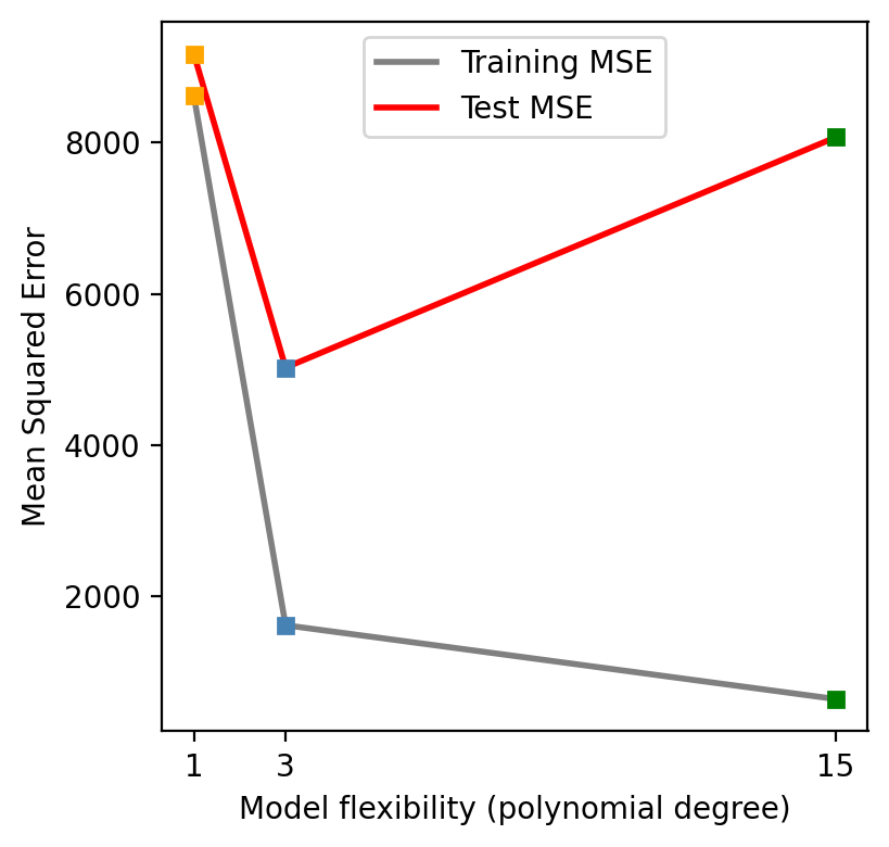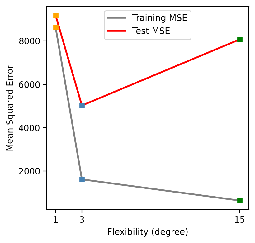 It is important to have in mind that as model flexibility increases, the training MSE will decrease, but the test MSE may not!
