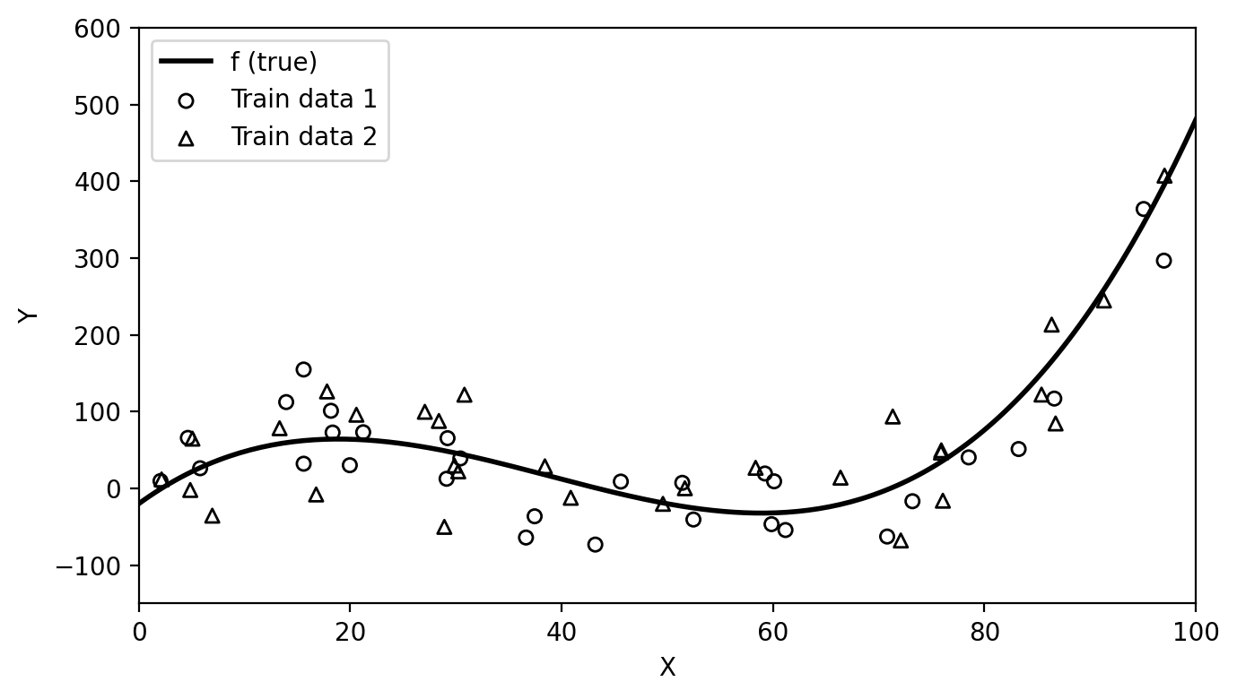 ax.scatter(x_obs_2, y_obs_2, s=30, facecolors='none', edgecolors='black', zorder=5, marker='^', label='Train data 2')