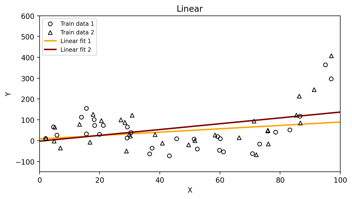 ax.plot(x, y_linear, color='orange', linewidth=2, label='Linear fit 1')