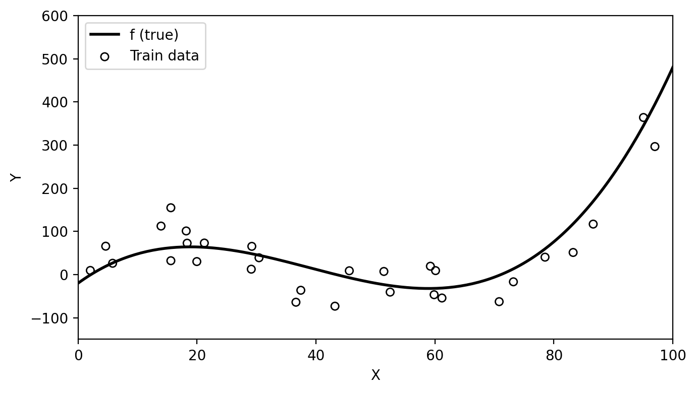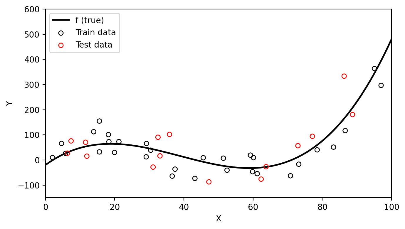 Below we have simulated train data based on the function \(f\) shown in black in the plot.