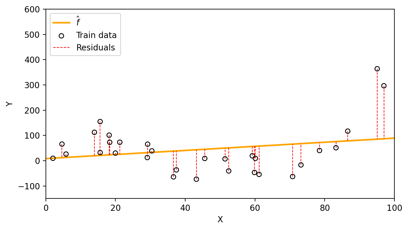 train_mse = np.mean((y_obs - y_hat_obs)**2)We fit a linear model to obtain the estimate \(\hat{f}(x)=\) 0.81x + 8.25. With this funciton we obtain the following residuals and a train MSE of 8614.9.