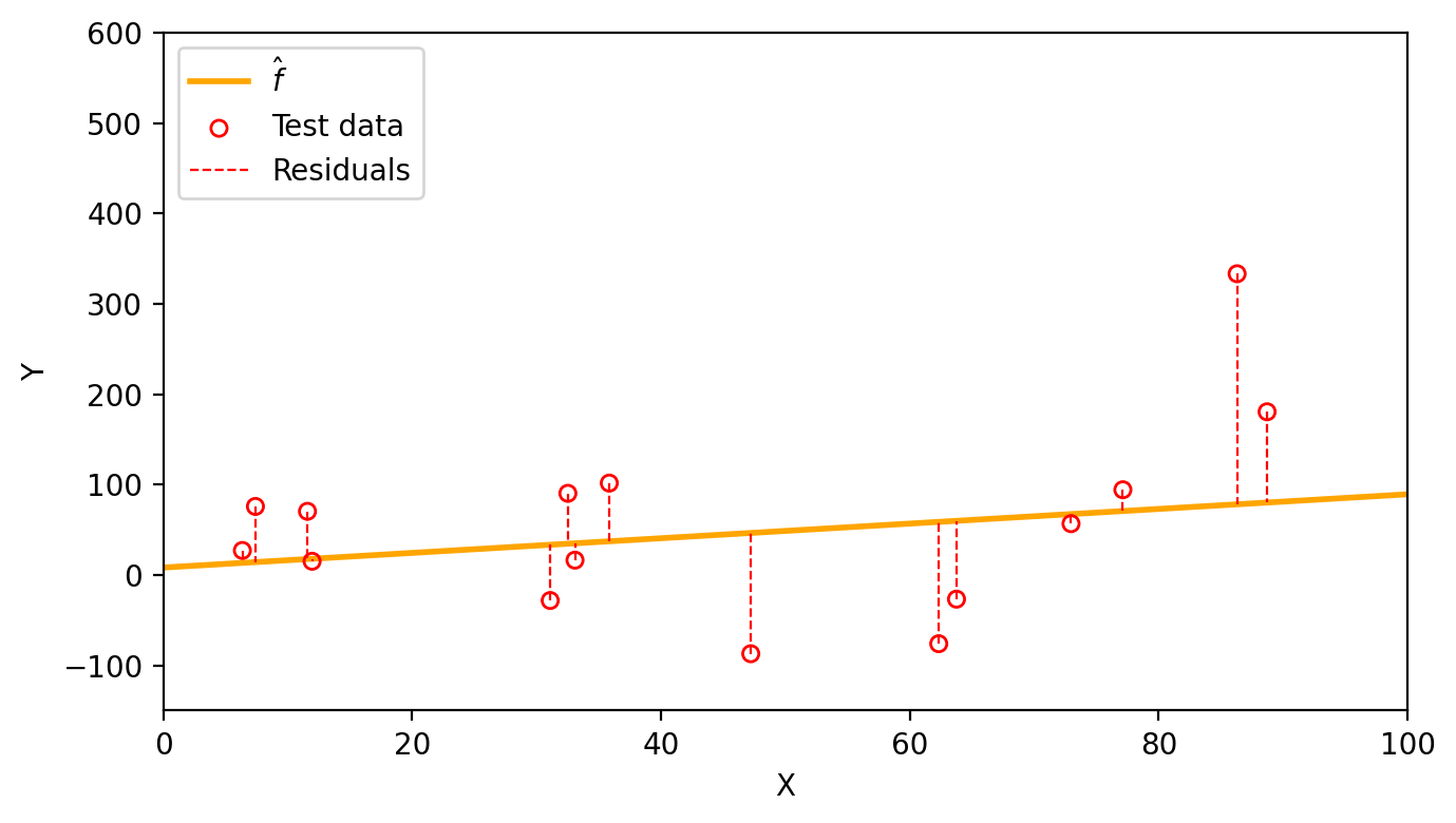 Now we can use the same linear estimate \(\hat{f}(x)=\) 0.81x + 8.25 to visualize the test residuals and calcualte a test MSE of 9169.18.
