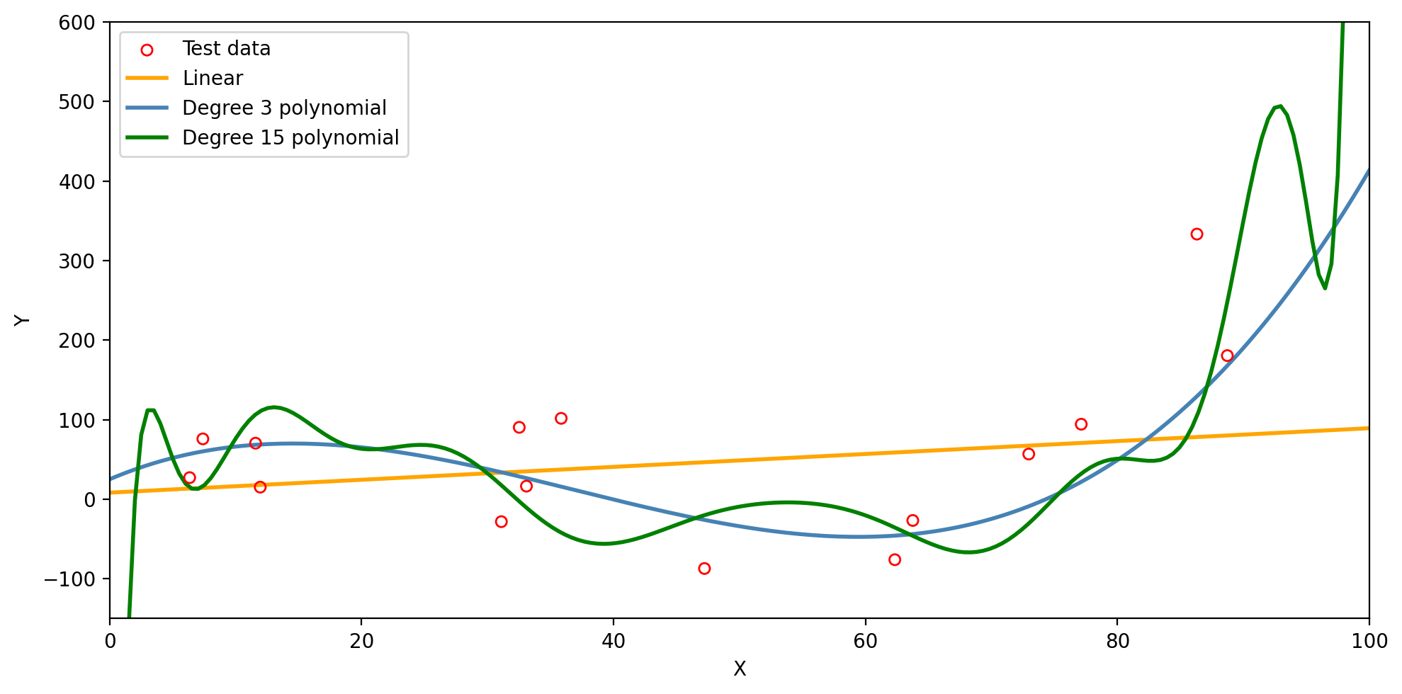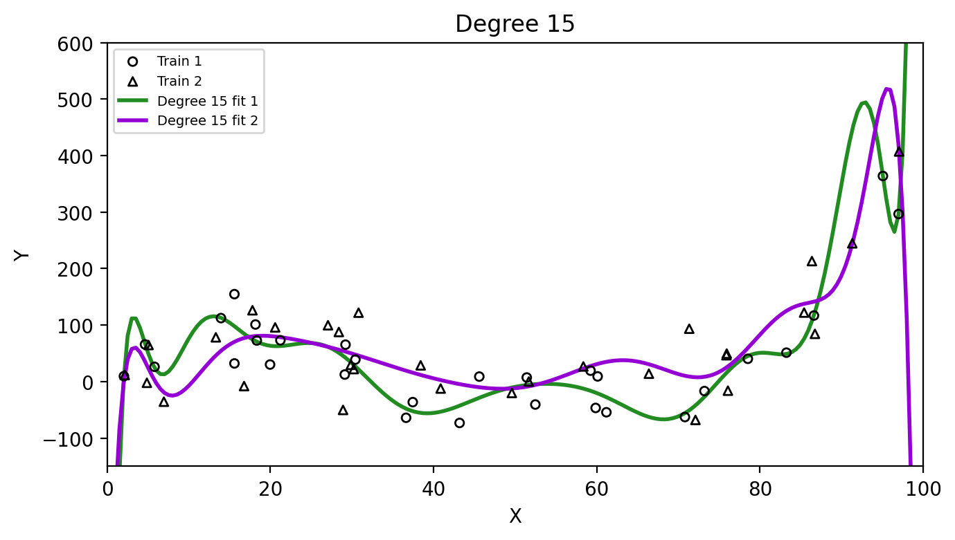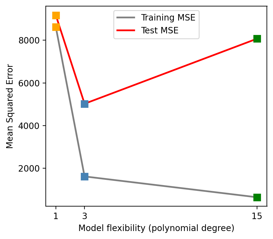 The degree 15 polynomial has the lowest training MSE but fails to capture the trend in the test data.