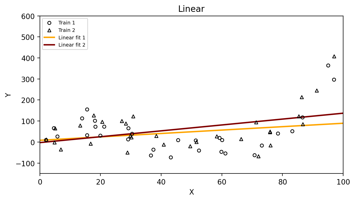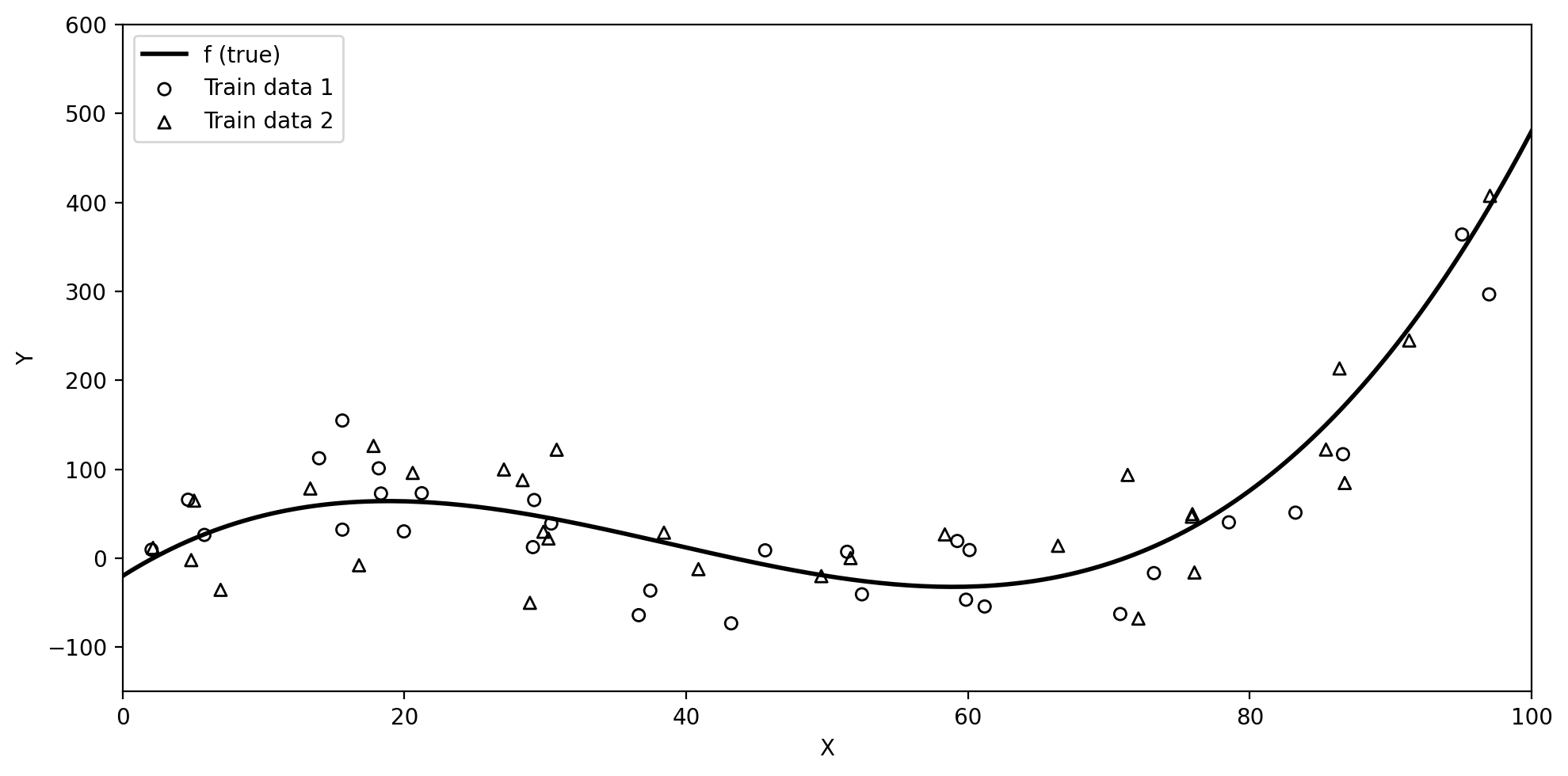 Both datasets come from the same true \(f\) but differ due to random noise.