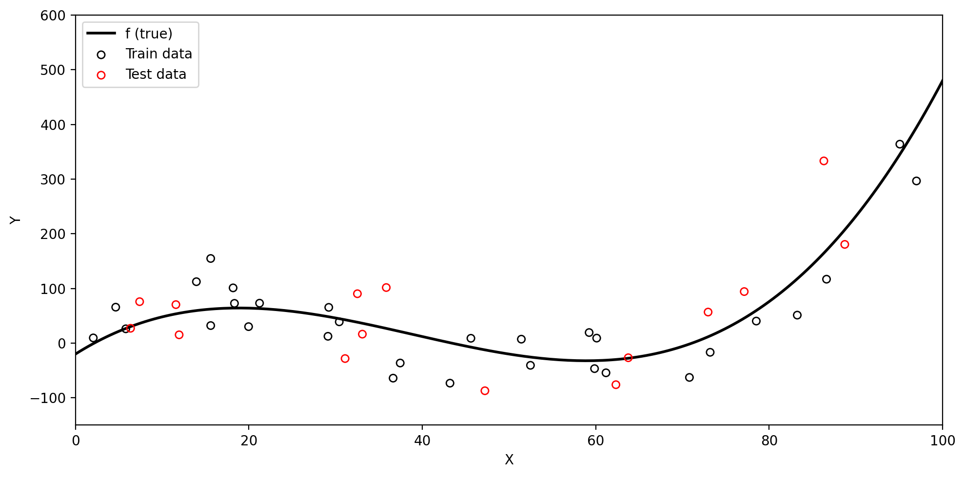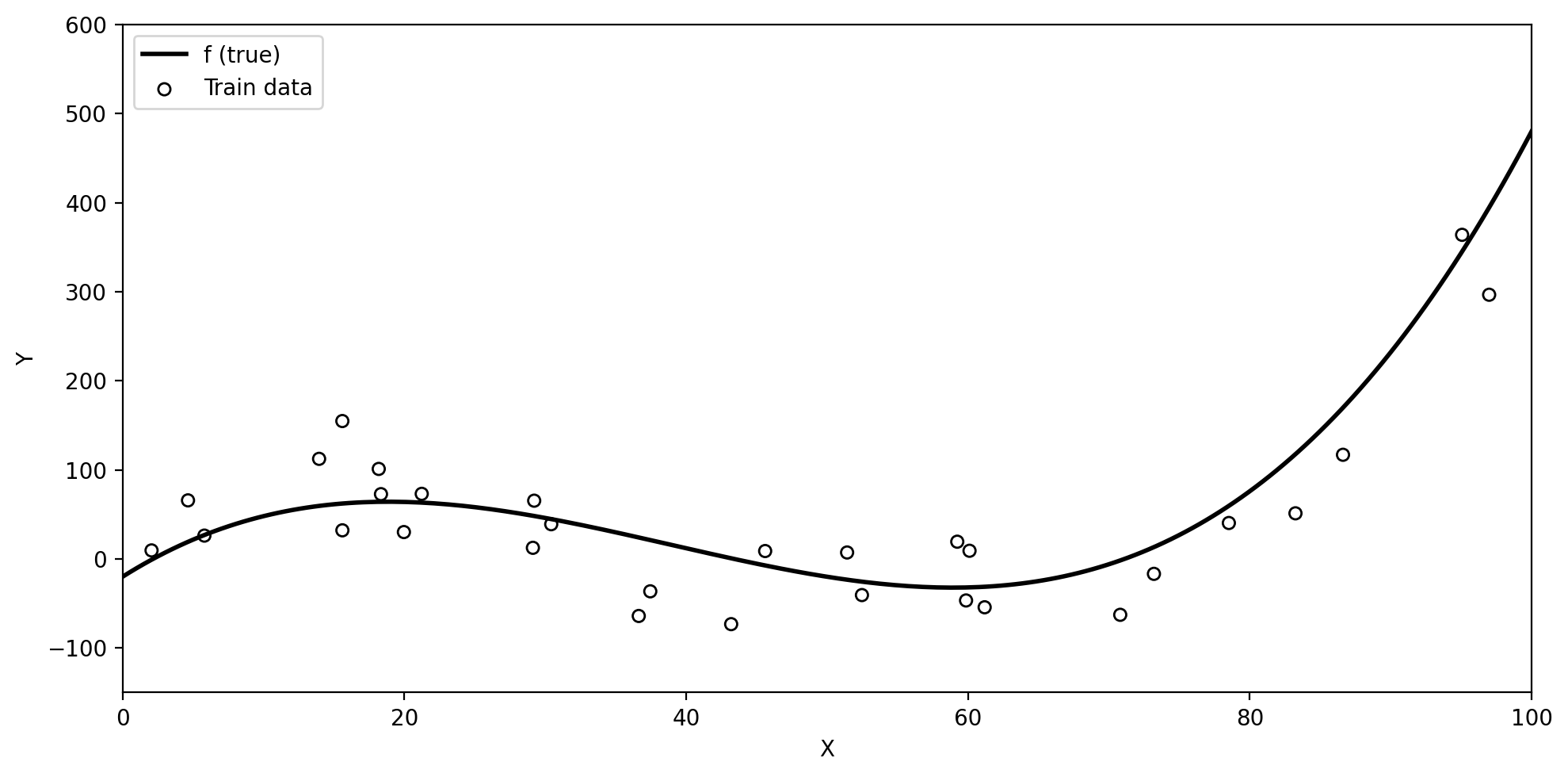 Below we have simulated train data based on the true underlying function \(f\) (black line).