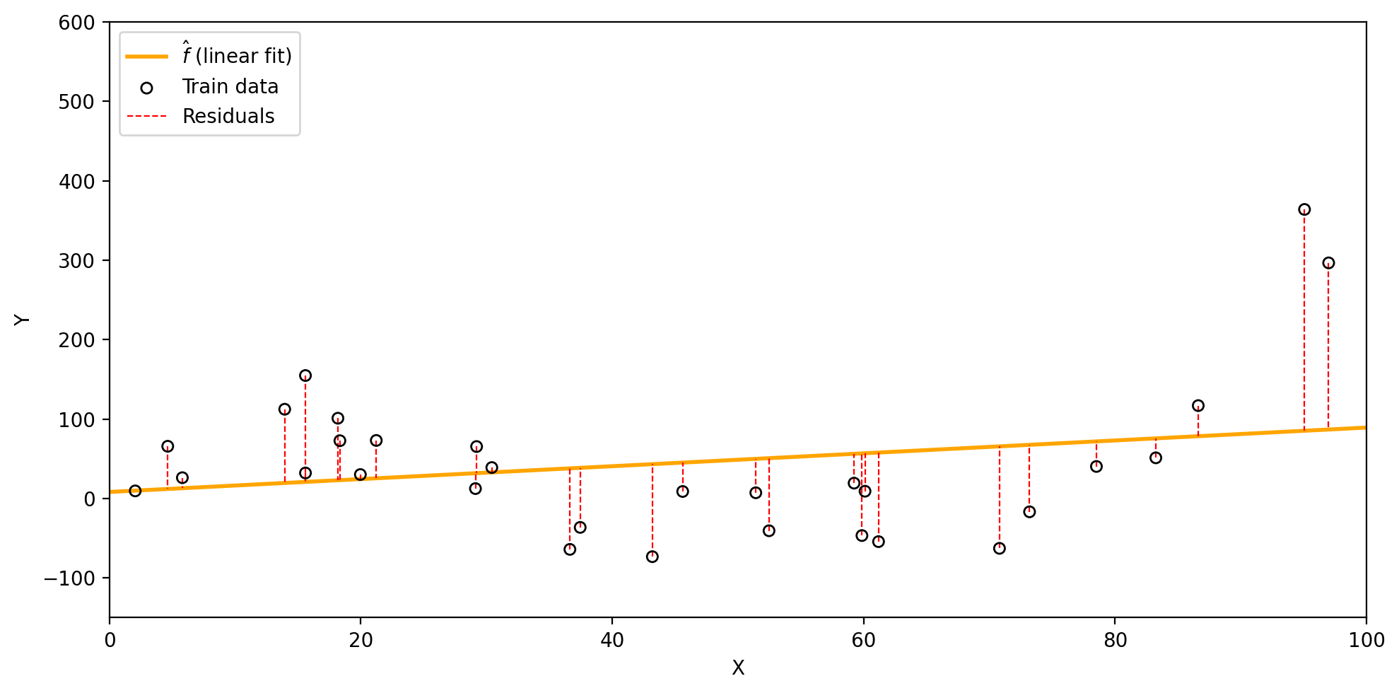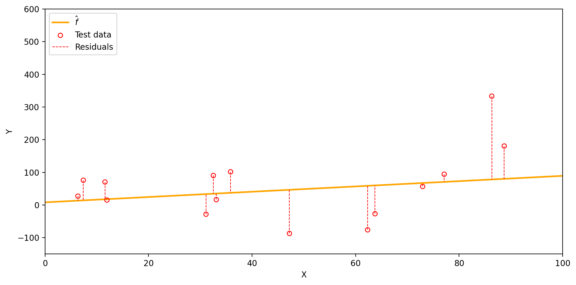 The residuals (dashed red lines) show the difference between each \(y_i\) and \(\hat{f}(x_i)\).
