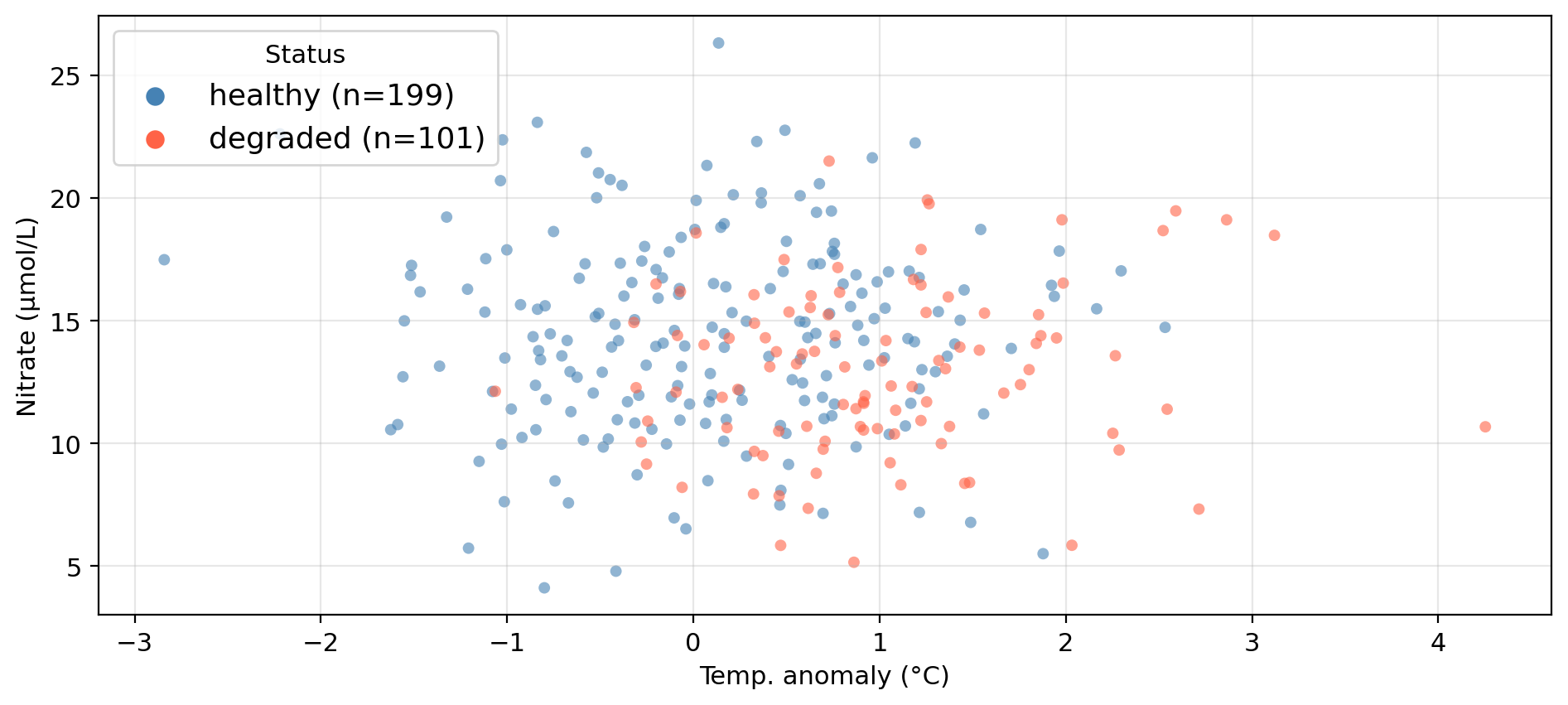 temp_anomaly— sea surface temperature anomaly (°C): deviation of ocean’s temperature from long-term averagenitrate— nitrate concentration (μmol/L)status— kelp forest condition: healthy or degraded