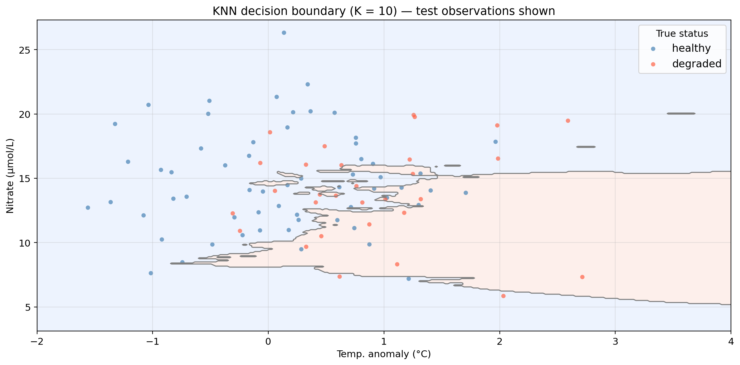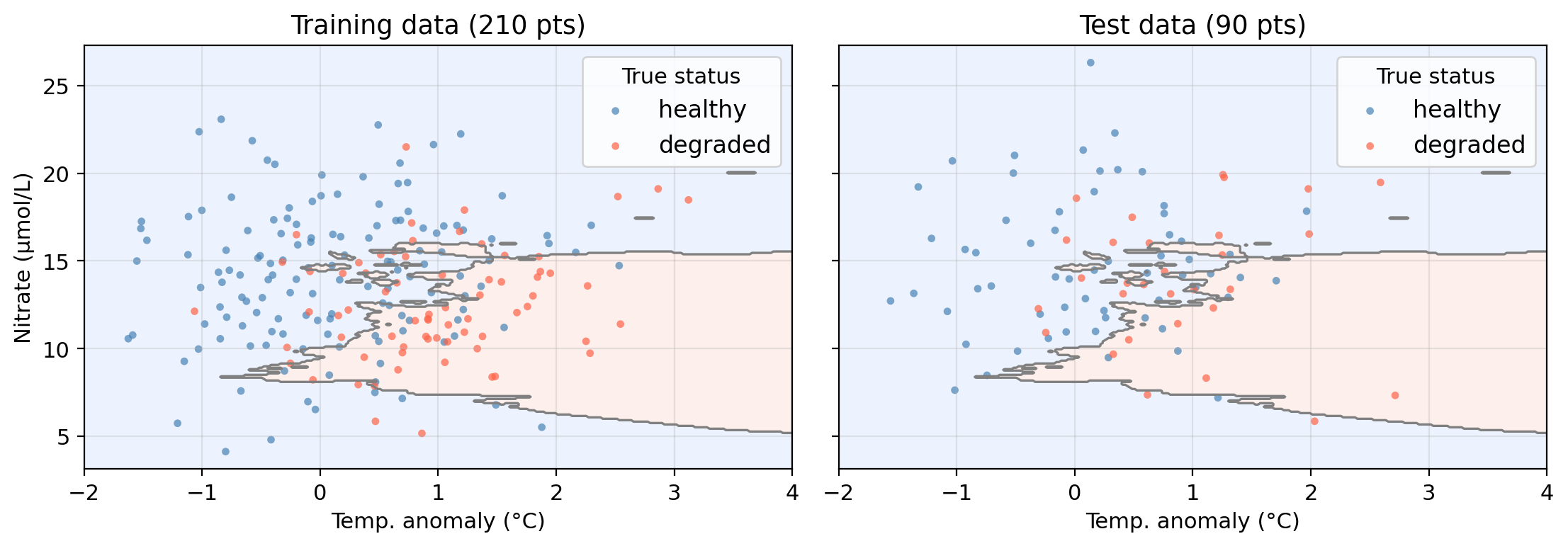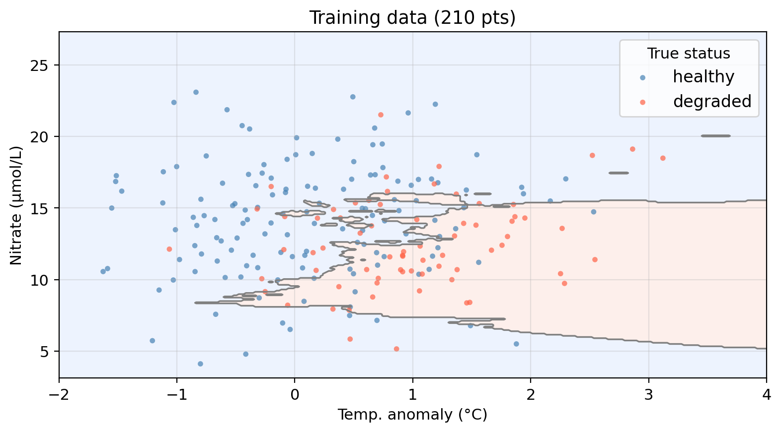 temp_anomaly — sea surface temperature anomaly (°C): deviation of ocean’s temperature from long-term averagenitrate — nitrate concentration (μmol/L)status — kelp forest condition: healthy or degradedCan we predict whether a site is healthy or degraded