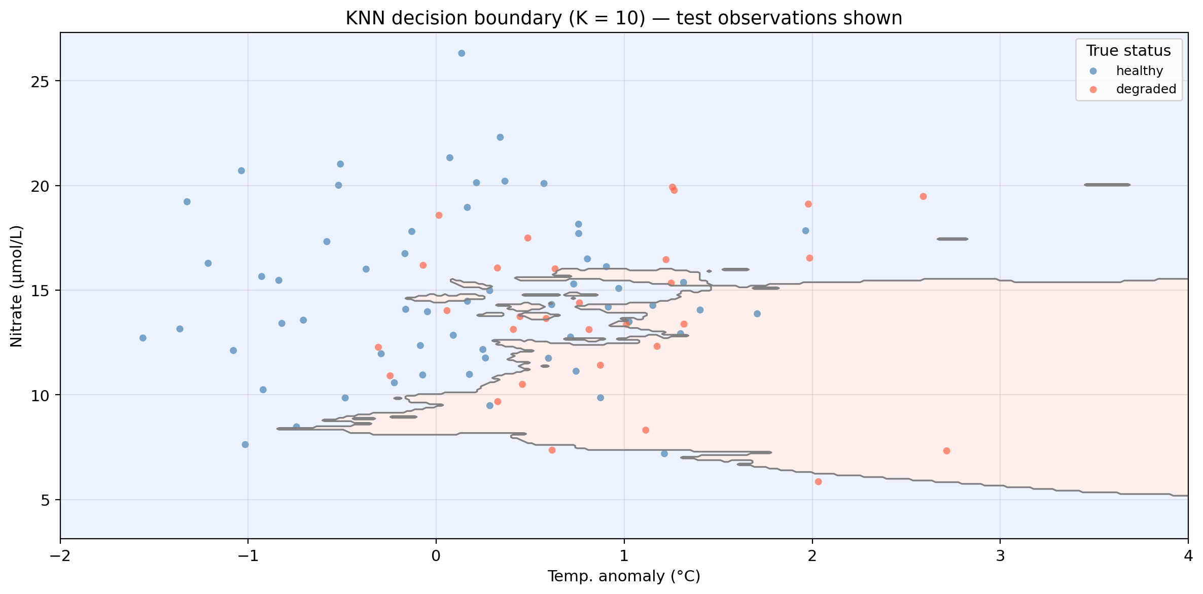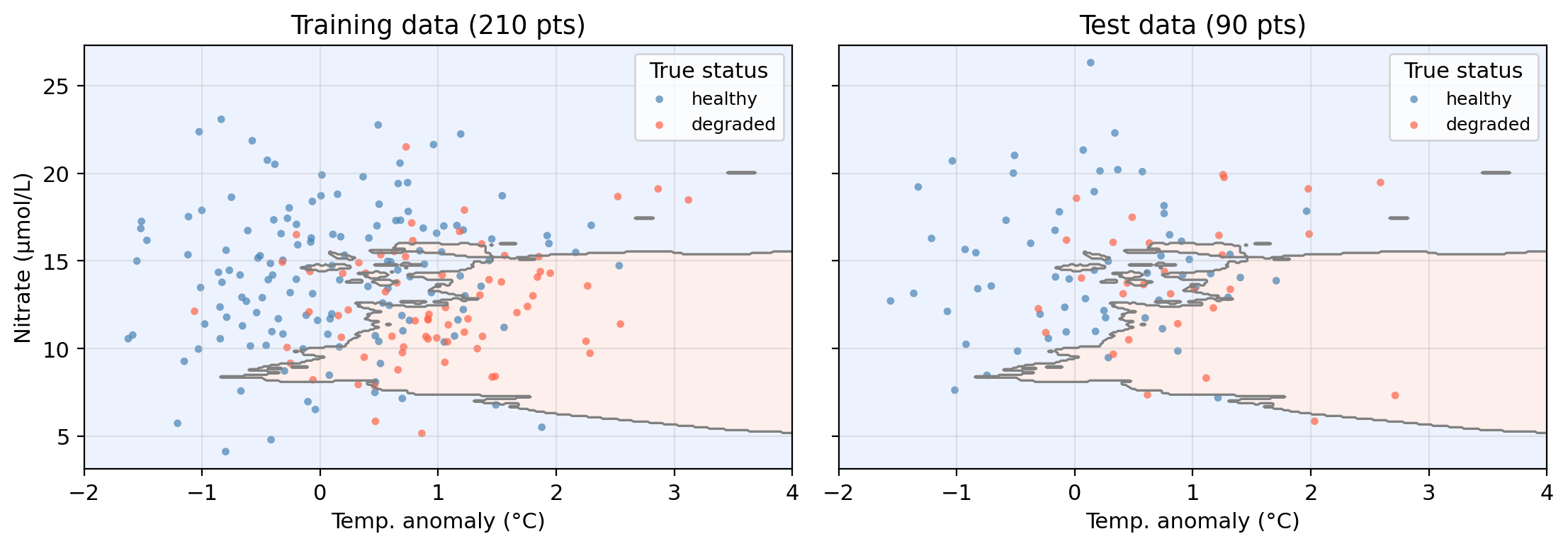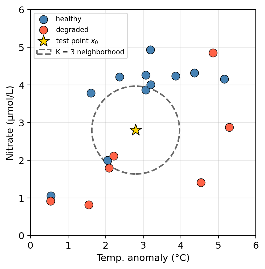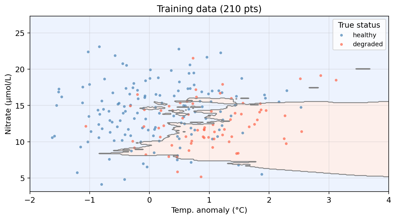 temp_anomaly — sea surface temperature anomaly (°C): deviation of ocean’s temperature from long-term averagenitrate — nitrate concentration (μmol/L)status — kelp forest condition: healthy or degradedCan we predict whether a site is healthy or degraded