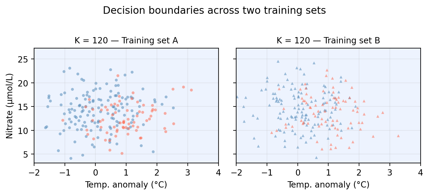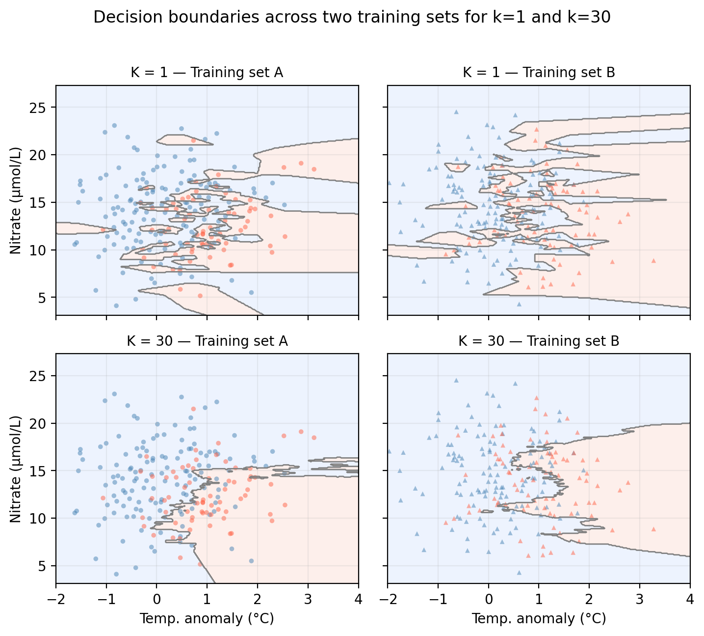 # Generate a second training set from the same data-generating processnp.random.seed(99)n2 =len(X_train)temp2 = np.random.normal(0.4, 1.0, n2)nit2 = np.random.normal(14, 4, n2)up2 = np.random.binomial(1, 0.5, n2)log_odds2 =-0.8+ (-1.5* temp2) + (0.10* nit2) + (1.8* up2)prob2 =1/ (1+ np.exp(-log_odds2))status2 = np.where(np.random.binomial(1, prob2, n2) ==1, 'healthy', 'degraded')X_train2 = np.column_stack([temp2, nit2])y_train2 = status2k_bv = [1, 30]train_sets = [('Training set A', X_train, y_train, 'o'), ('Training set B', X_train2, y_train2, '^')]col_map = {'healthy': 'steelblue', 'degraded': 'tomato'}fig, axes = plt.subplots(2, 2, figsize=(fig_size_x *0.91, (fig_size_y +0.5) *1.4), sharex=True, sharey=True)for row, k inenumerate(k_bv):for col, (set_name, X_tr, y_tr, mkr) inenumerate(train_sets): ax = axes[row, col] knn_bv = KNeighborsClassifier(n_neighbors=k) knn_bv.fit(X_tr, y_tr) gp = knn_bv.predict(np.c_[xx1.ravel(), xx2.ravel()]).reshape(xx1.shape) gn = (gp =='healthy').astype(int) ax.contourf(xx1, xx2, gn, alpha=0.15, cmap='coolwarm_r', levels=[-0.5, 0.5, 1.5]) ax.contour(xx1, xx2, gn, colors='gray', linewidths=1.0, levels=[0.5])for label, c in col_map.items(): mask = y_tr == label ax.scatter(X_tr[mask, 0], X_tr[mask, 1], color=c, marker=mkr, s=12, alpha=0.5, edgecolors='none') ax.set_xlim(-2, 4) ax.set_title(f'K = {k} — {set_name}', fontsize=10) ax.grid(True, alpha=0.2)if col ==0: ax.set_ylabel('Nitrate (μmol/L)')if row ==1: ax.set_xlabel('Temp. anomaly (°C)')fig.suptitle('Decision boundaries across two training sets for k=1 and k=30', y=1.02)plt.tight_layout()plt.show()plt.close()