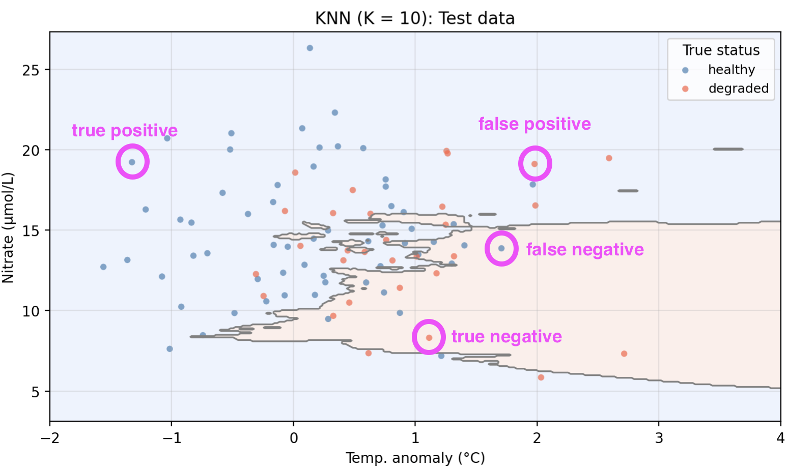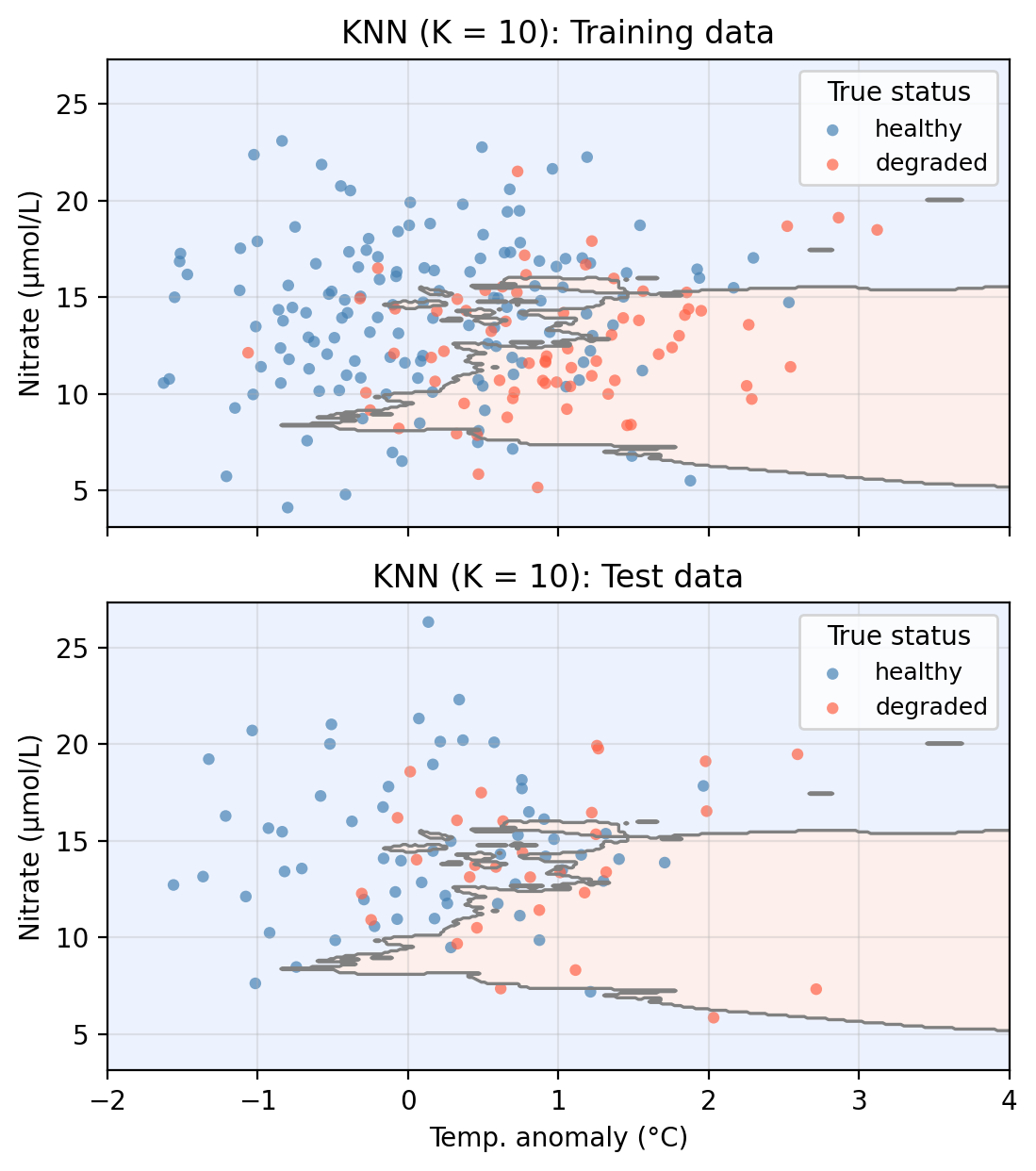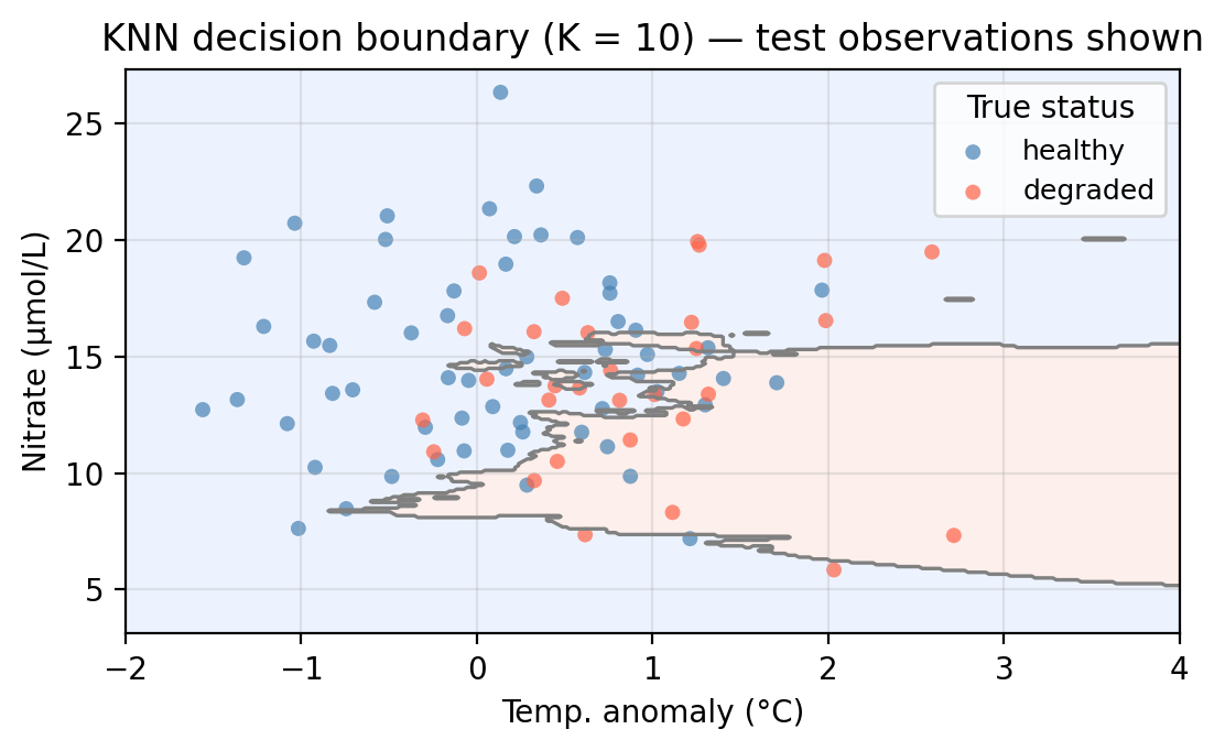 We now apply KNN to our example data using temp_anomaly and nitrate as predictors. To do so, we use a 70-30 split in our observations and obtain a training set with 210 points and a test set with 90 points. The plot below shows the training and test sets along with the decision boundary learned by KNN with \(K = 10\).