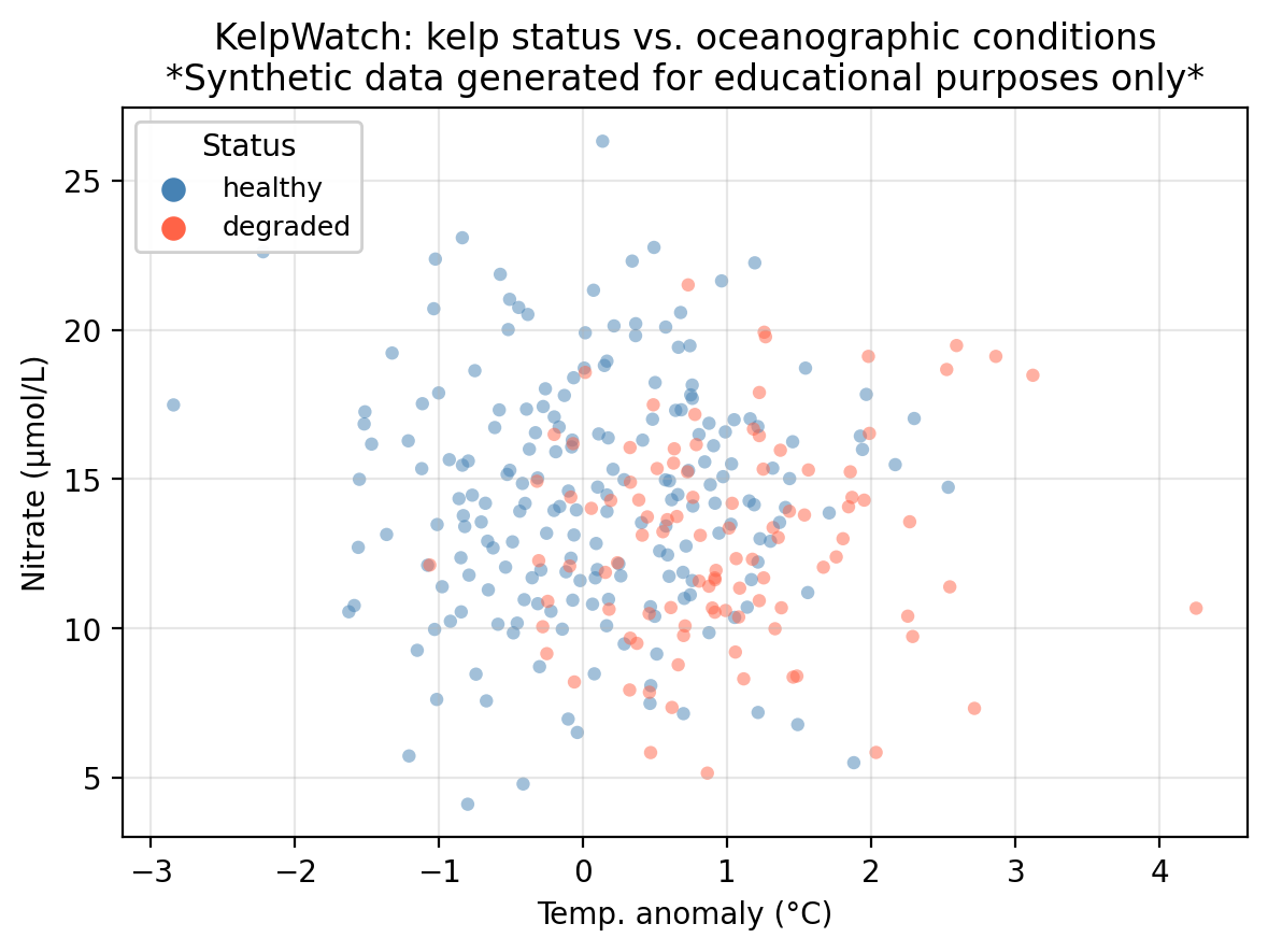 colors = {'healthy': 'steelblue', 'degraded': 'tomato'}markers = {1: 'o', 0: 's'}fig, ax = plt.subplots(figsize=(fig_size_x *0.75, fig_size_y +0.5))for up_val in [1, 0]:for status_val, col in colors.items(): mask = (df['upwelling'] == up_val) & (df['status'] == status_val) ax.scatter( df.loc[mask, 'temp_anomaly'], df.loc[mask, 'nitrate'], c=col, s=20, alpha=0.5, edgecolors='none' )# Legend 1: kelp status (colors)status_handles = [ plt.scatter([], [], c=col, s=50, label=lab)for lab, col in colors.items()]leg1 = ax.legend(handles=status_handles, title='Status', fontsize=9, loc='upper left')ax.add_artist(leg1)ax.set_xlabel('Temp. anomaly (°C)')ax.set_ylabel('Nitrate (μmol/L)')ax.set_title('KelpWatch: kelp status vs. oceanographic conditions\n''*Synthetic data generated for educational purposes only*')ax.grid(True, alpha=0.3)plt.tight_layout()plt.show()plt.close()