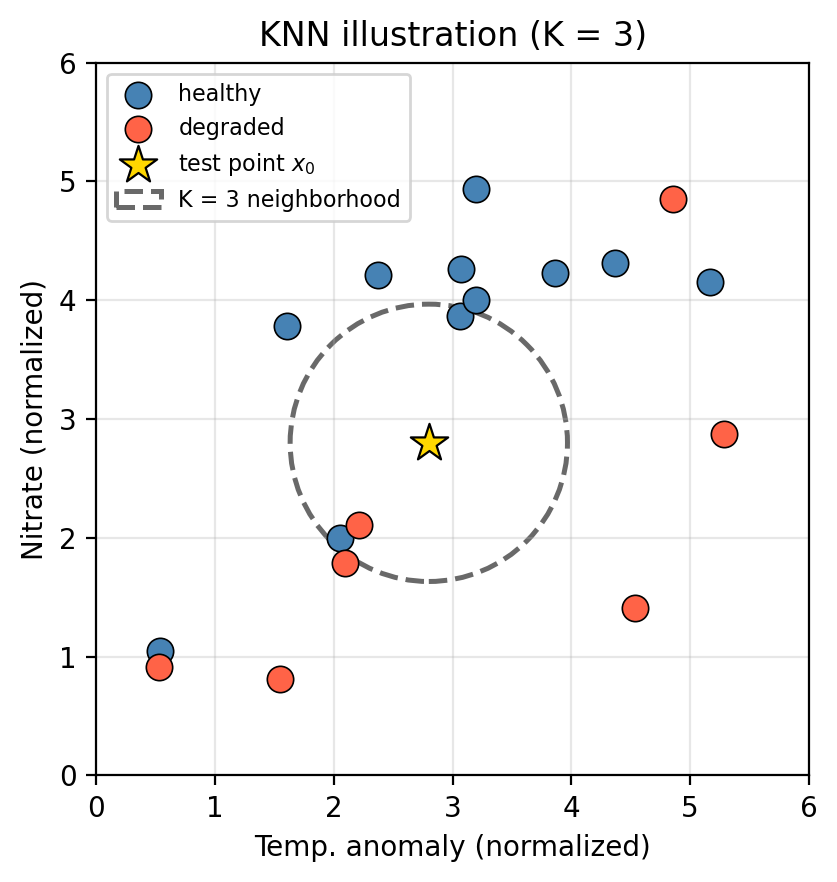 In the figure above, the star \(\star\) marks a new test observation \(x_0\). The dashed circle encloses its \(K = 3\) nearest neighbors.