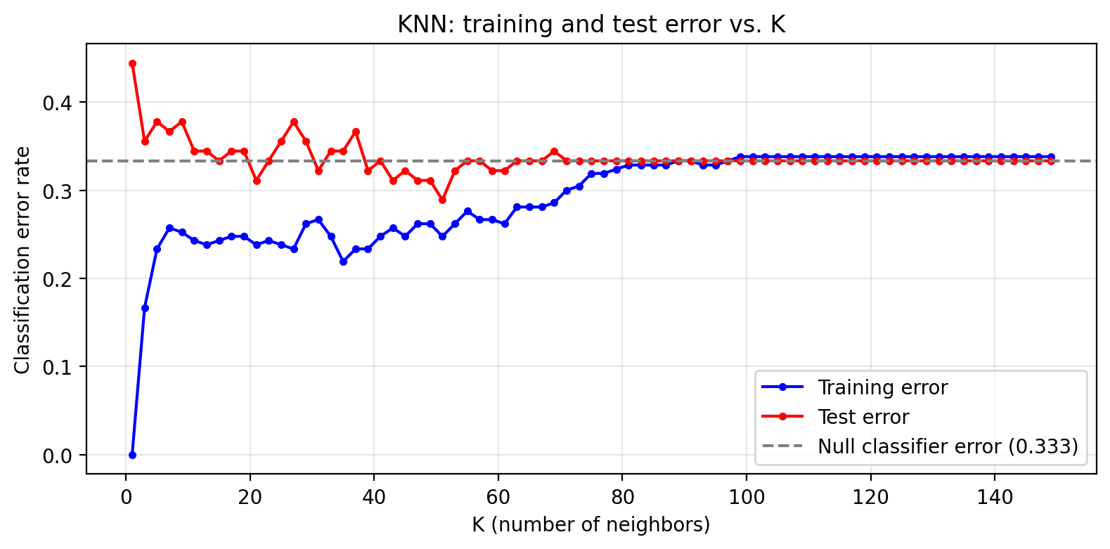 k_range =list(range(1, 151, 2))train_errors = []test_errors = []for k in k_range: knn_k = KNeighborsClassifier(n_neighbors=k) knn_k.fit(X_train, y_train) train_errors.append(1- knn_k.score(X_train, y_train)) test_errors.append(1- knn_k.score(X_test, y_test))null_error =1- null_accfig, ax = plt.subplots(figsize=(fig_size_x, fig_size_y))ax.plot(k_range, train_errors, 'b-o', markersize=3, label='Training error')ax.plot(k_range, test_errors, 'r-o', markersize=3, label='Test error')ax.axhline(null_error, color='gray', linestyle='--', linewidth=1.5, label=f'Null classifier error ({null_error:.3f})')ax.set_xlabel('K (number of neighbors)')ax.set_ylabel('Classification error rate')ax.set_title('KNN: training and test error vs. K')ax.legend(loc='lower right')ax.grid(True, alpha=0.3)plt.tight_layout()plt.show()plt.close()