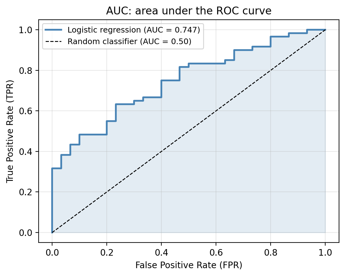 - ROC curves and the AUC as tools for evaluating classifier performance across thresholds