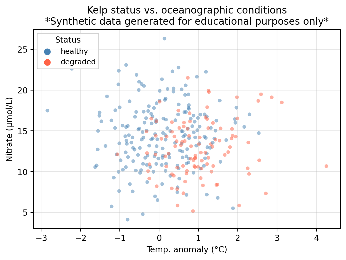 temp_anomaly— sea surface temperature anomaly (°C); positive values indicate warmer-than-average conditionsnitrate— nitrate concentration (μmol/L); higher values generally support kelp growthstatus— observed kelp forest condition: healthy or degraded
