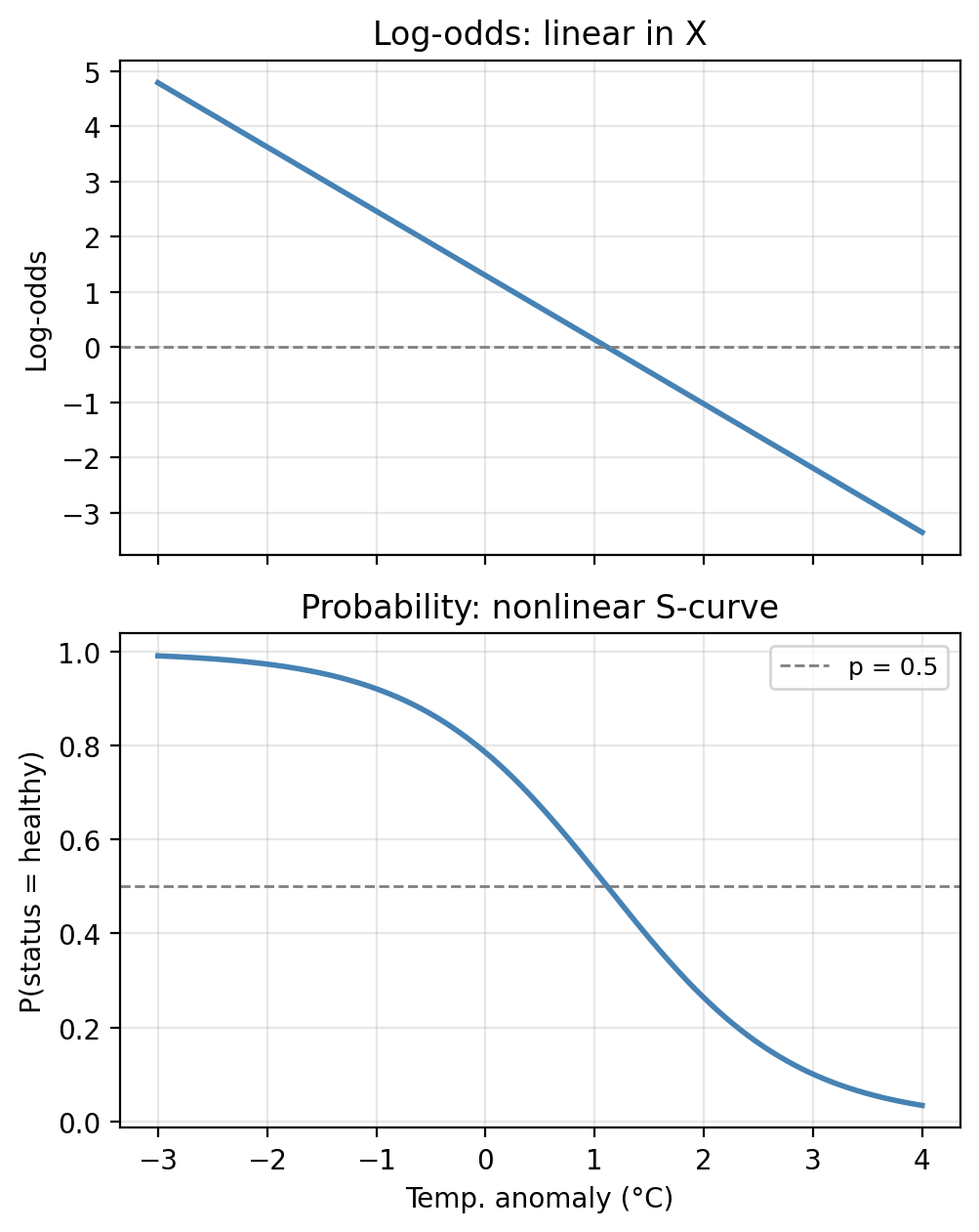 Notice that the log-odds is exactly linear in \(X\) (top panel), but when we transform back to the probability scale we get the familiar S-shape (bottom panel). The two representations contain identical information, just at different scales.