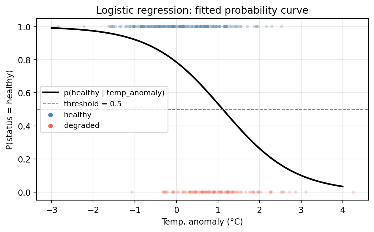 Using the fitted model above, what is the predicted status of a site with temp_anomaly = 0.5°C? Use the default threshold \(\alpha = 0.5\).