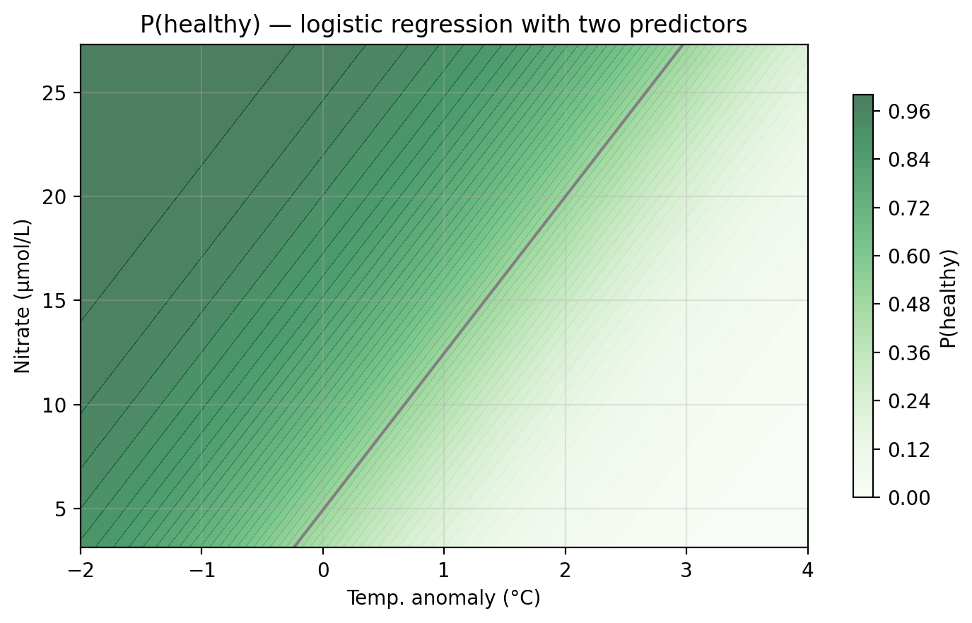 For our example data, we can now fit a logistic regression using both temp_anomaly and nitrate as predictors. The plot below shows the predicted probability surface across the feature space. Darker green indicates higher probability of healthy status. The gray line is the decision boundary at \(\alpha = 0.5\).