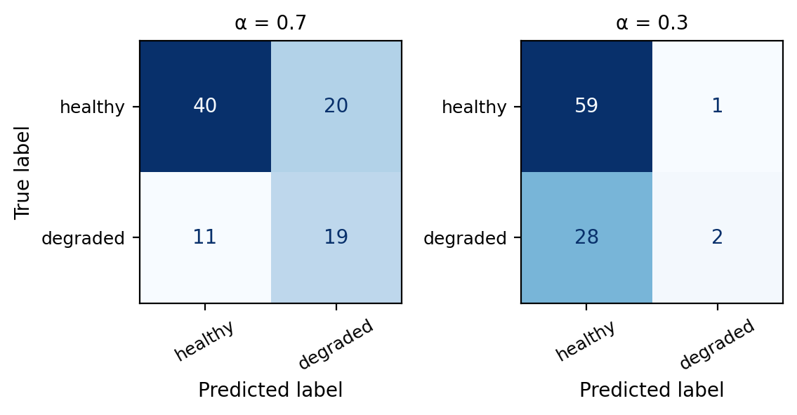 \(\alpha = 0.2\): Almost every site is classified as healthy. Most truly healthy sites are caught → very few false negatives → high recall. But many degraded sites are also classified as healthy → many false positives → precision falls.