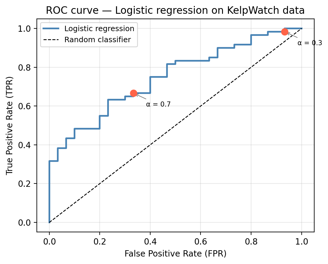 Back in our kelp forest example, the logistic regression model gives an AUC of 0.747.
