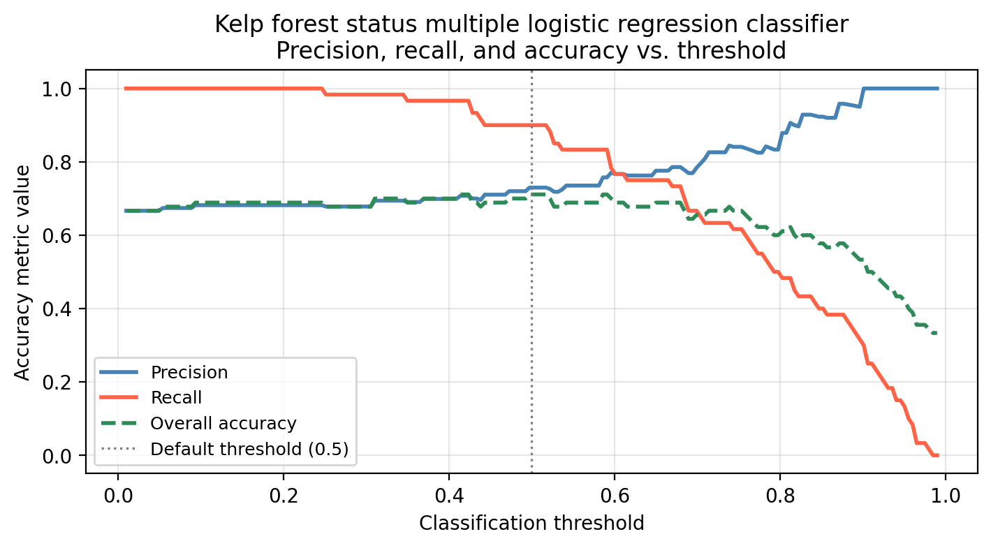 The graph below shows the precision, recall, and overall accuracy for our multiple logistic regression kelp forest status classifier at different classification threshold levels.