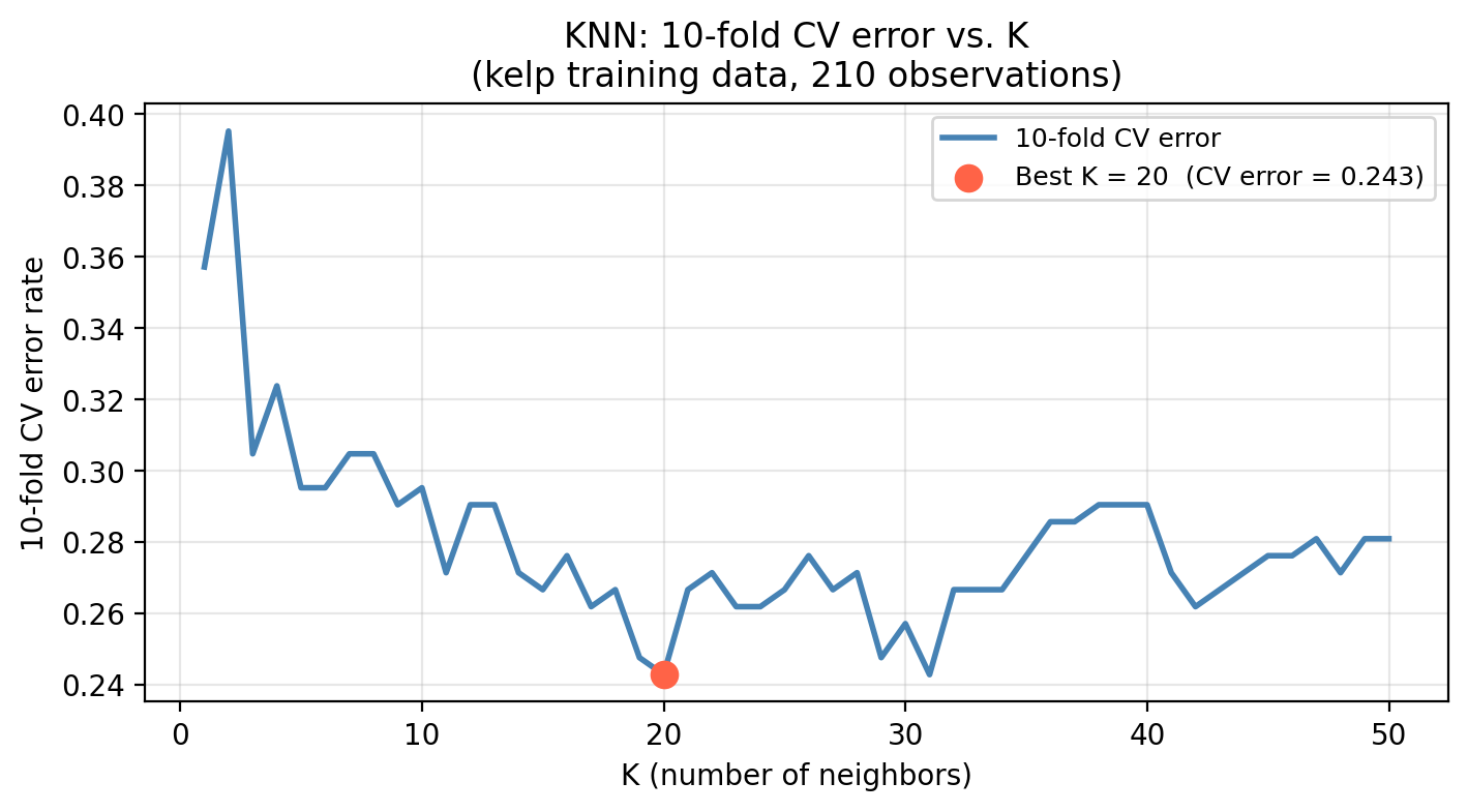 In our kelp classification task, KNN requires choosing \(K\), the number of neighbors. Recall a small \(K\) produces a flexible model that may overfit; a large \(K\) produces a smooth model that may underfit. Cross-validation gives us a way to select \(K\) without touching the test set: