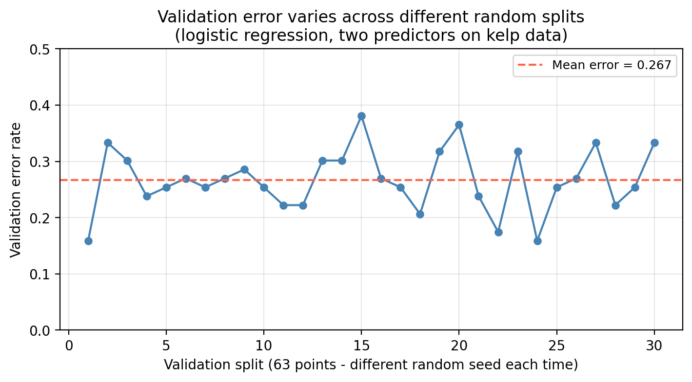 Notice that when we divide our data into training and validation sets in step 1, the test error estimate depends on the particular randomly selected validation set. This is a drawback of the validation set approach since different validation sets can greatly vary the test error estimate (high variance). We can see this variation in our example kelp classification data when we use different random splits to create the validation set: