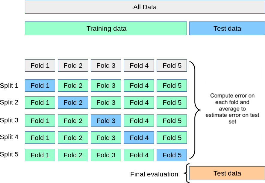 scikit-learn’s documentation on cross-validationOur dataset has 210 observations in the training set and 90 in the test set. By using 5-fold CV on our workflow: