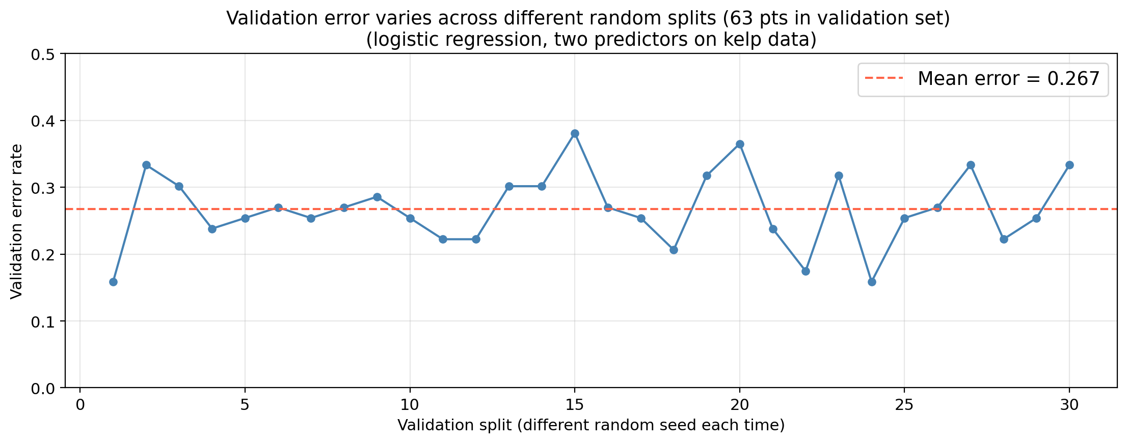 Same model, same data, only the split changes. The error estimate varies substantially across splits.