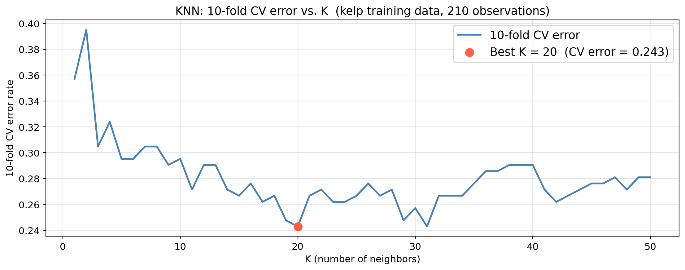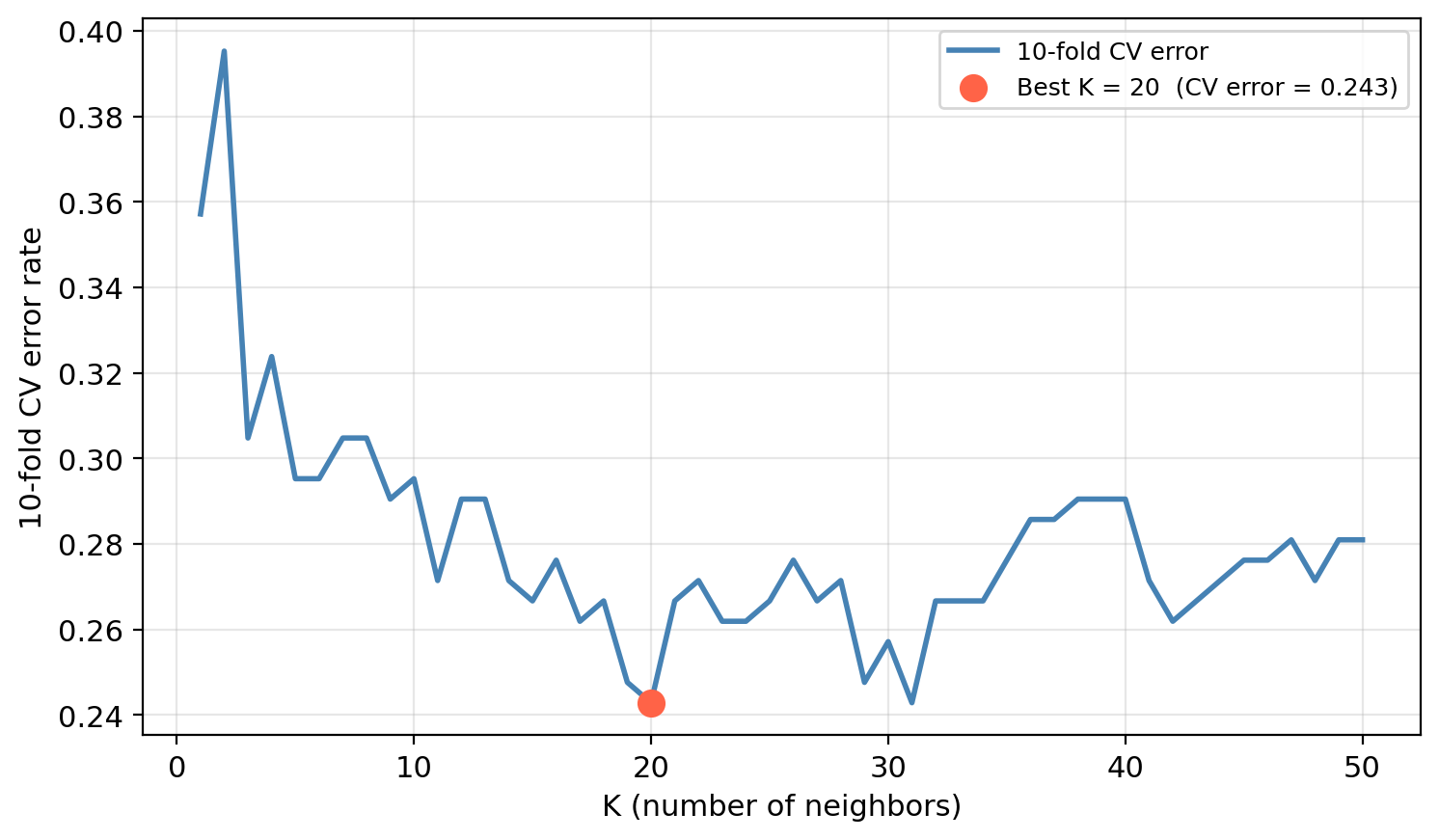 For each value of \(K\) we estimate the test error rate using 10-fold CV.